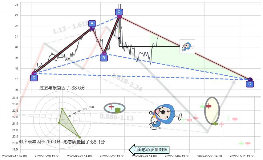 ➢ 2022-04-26 14:00-2022-07-15 13:00上升趋势存在反转[风险],虽然原上升趋势的支撑位(21.23)已破位,但其支撑效果尚存,原上升趋势角度: 38.1˚
