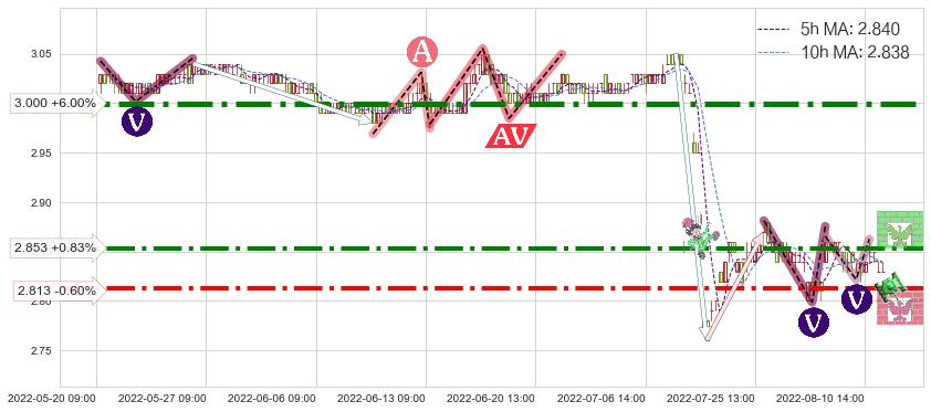 ♘ 阻力价格位3.000,可信任强度99.24%,距离最后交易2022-08-12 14:00形成的收盘价格2.830相差 +6.00%