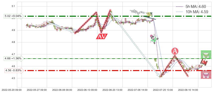 ♘ 阻力价格位4.66,可信任强度45.87%,距离最后交易2022-08-12 14:00形成的收盘价格4.60相差 +1.36%