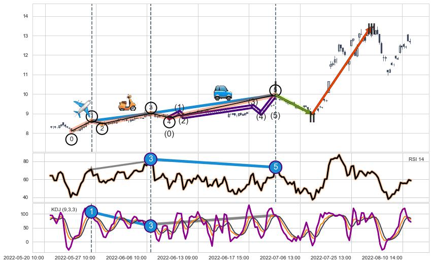 从2022-05-23 14:00至2022-08-01 13:00,共包含153个小时,阶段股价上涨49.73%,阶段股价变动位移路程比: 1 : 3