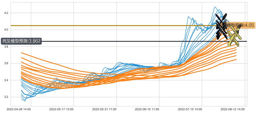 ➣ 34小时均线于(08-01 14:00: 4.09)形成【死叉】基于【死叉历史模型】预测死叉后最低波谷价格: 3.904, 死叉后最低价格3.860,已经下跌超出预测最低波谷价格, 预期反弹
