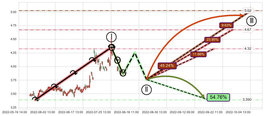 ♘ 阻力价格位4.35,可信任强度54.39%,距离最后交易2022-08-12 14:00形成的收盘价格3.970相差 +9.57%