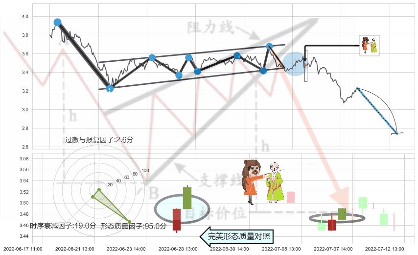 从2022-06-22 14:00至2022-07-01 13:00,共包含14个小时,阶段股价上涨3.48%,阶段股价变动位移路程比: 1 : 1.8