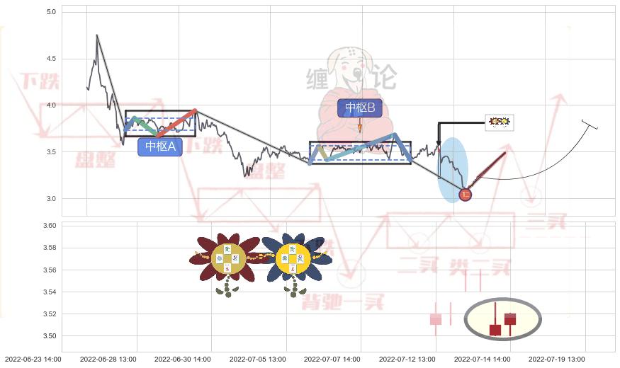 ➣ 【中枢B】:05-19:09-06-22:14,中枢由5笔构成,共111交易小时, ZG=3.560, ZD=3.410