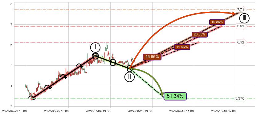 ➣ 调整浪已超过预测的c点位置,但后续大趋势循环浪高概率反转下跌,继续上涨概率48.66%,谨慎做多