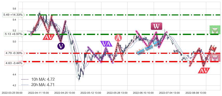 ♘ 阻力价格位5.13,可信任强度97.52%,距离最后交易2022-08-12 14:00形成的收盘价格4.80相差 +6.97%