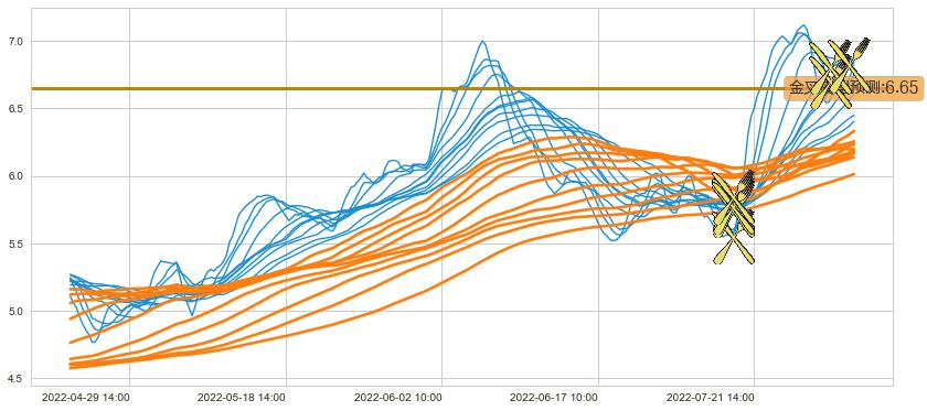 ➢ 35小时均线于(07-15 14:00: 5.78)形成【金叉】基于【金叉历史模型】预测金叉后最高波峰价格: 6.14, 金叉后最高价格7.27,已经上涨超出预测最高波峰价格, 预期回调