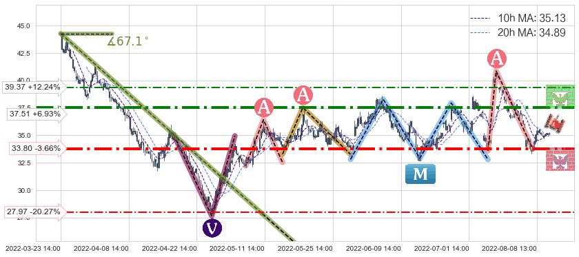♘ 阻力价格位37.51,可信任强度81.87%,距离最后交易2022-08-12 14:00形成的收盘价格35.08相差 +6.93%