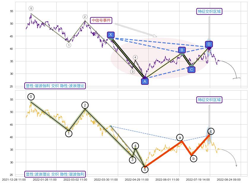 ➢ 谐波伽利:c上拉到达d:猜想下沉 → 下跌 →【拐点】强阻力临近 → 大趋势均值回复
