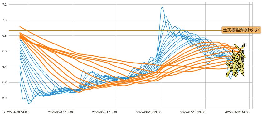 ➢ 40小时均线于(08-10 14:00: 6.45)形成【金叉】基于【金叉历史模型】预测金叉后最高波峰价格: 6.74, 金叉后最高价格6.92,已经上涨超出预测最高波峰价格, 预期回调