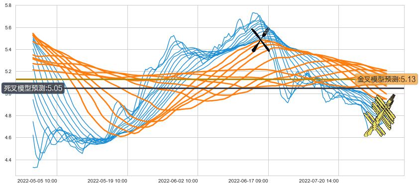 ➢ 60小时均线于(06-15 14:00: 5.48)形成【死叉】基于【死叉历史模型】预测死叉后最低波谷价格: 5.05, 死叉后最低价格4.60,已经下跌超出预测最低波谷价格, 预期反弹