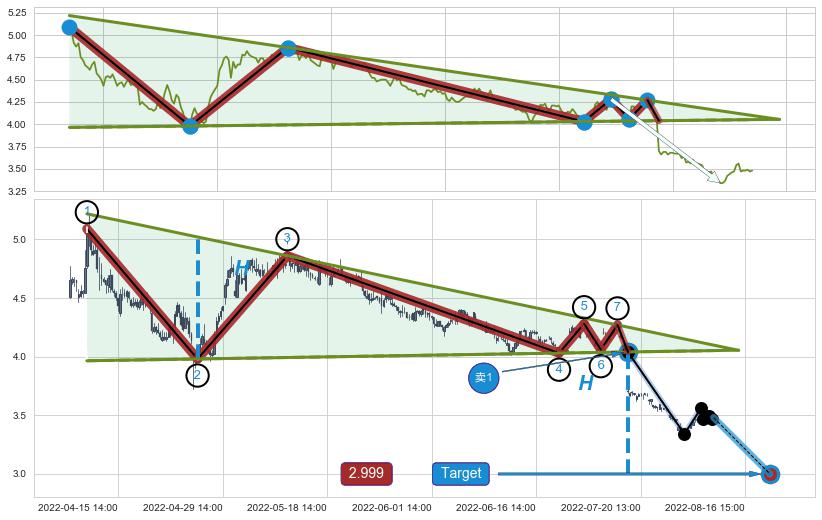 ➣ 下降对称三角整理:下行突破支撑位破位, 猜想持续下沉下跌,被突破的支撑位已变为阻力位