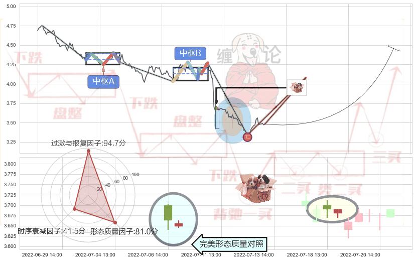 从2022-06-30 14:00至2022-08-12 14:00,共包含63个小时,阶段股价下跌-19.87%,阶段股价变动位移路程比: 1 : 2,2022-07-15 13:00向↘︎形成缺口,跳空下跌-9.09%˚