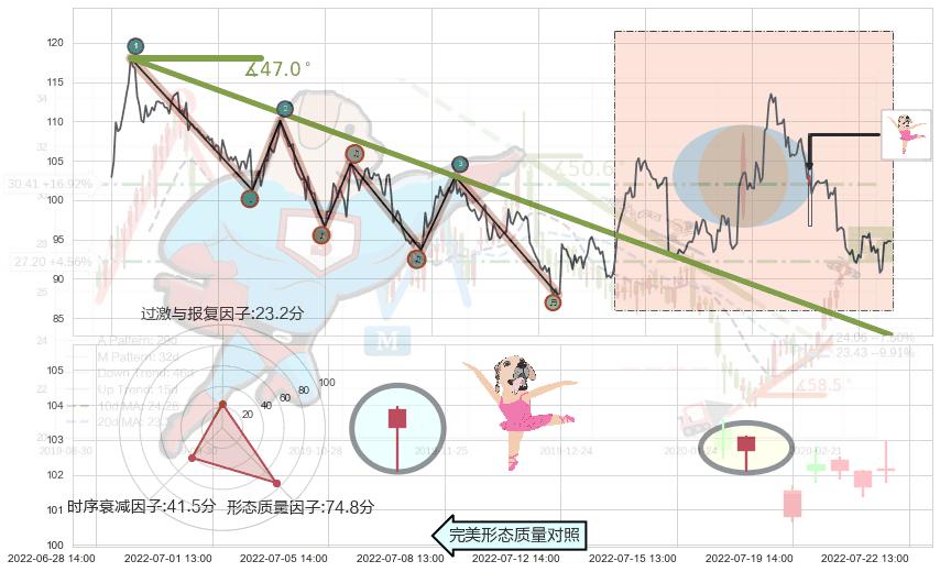 ➣ 2022-03-24 13:00-2022-06-08 09:00下跌趋势存在反转上涨[机会],其原下跌趋势的阻力位(82.85)已被突破[强支撑信号],原下跌趋势角度: 47.0˚