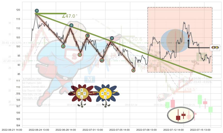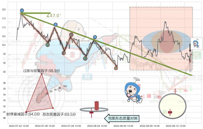 从2022-03-24 13:00至2022-06-08 09:00,共包含238个小时,阶段股价下跌-9.72%,阶段股价变动位移路程比: 1 : 24,下跌趋势角度: 47.0