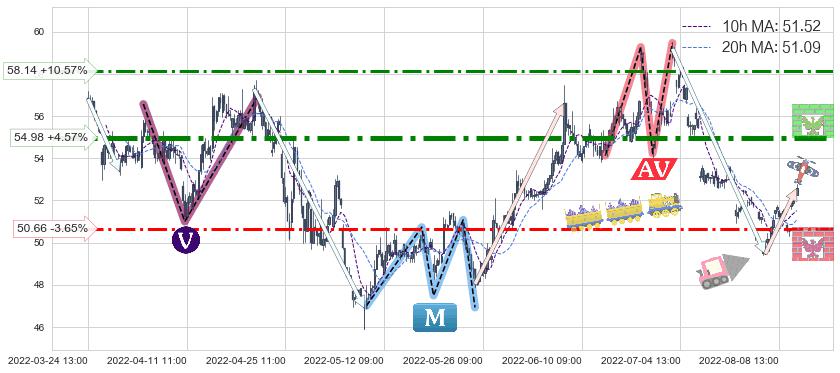 ♘ 阻力价格位54.98,可信任强度87.13%,距离最后交易2022-08-12 14:00形成的收盘价格52.58相差 +4.57%