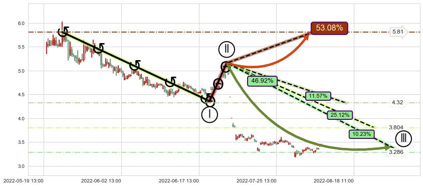从2022-07-04 13:00至2022-08-12 14:00,共包含59个小时,阶段股价下跌-14.55%,阶段股价变动位移路程比: 1 : 4