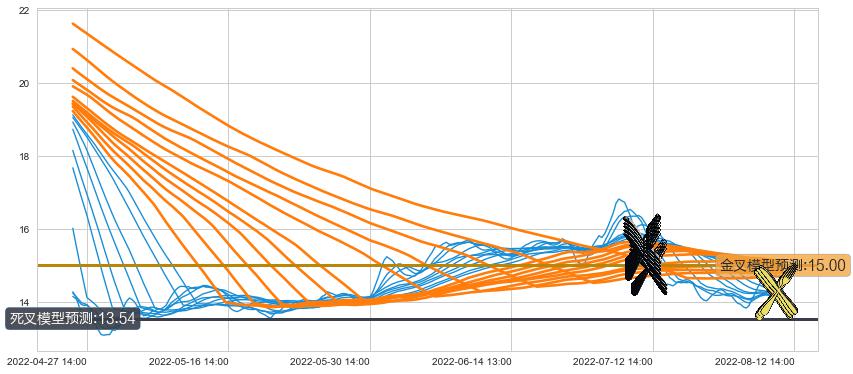 ➣ 55小时均线于(07-08 14:00: 15.69)形成【死叉】基于【死叉历史模型】预测死叉后最低波谷价格: 14.58, 死叉后最低价格13.70,已经下跌超出预测最低波谷价格, 预期反弹
