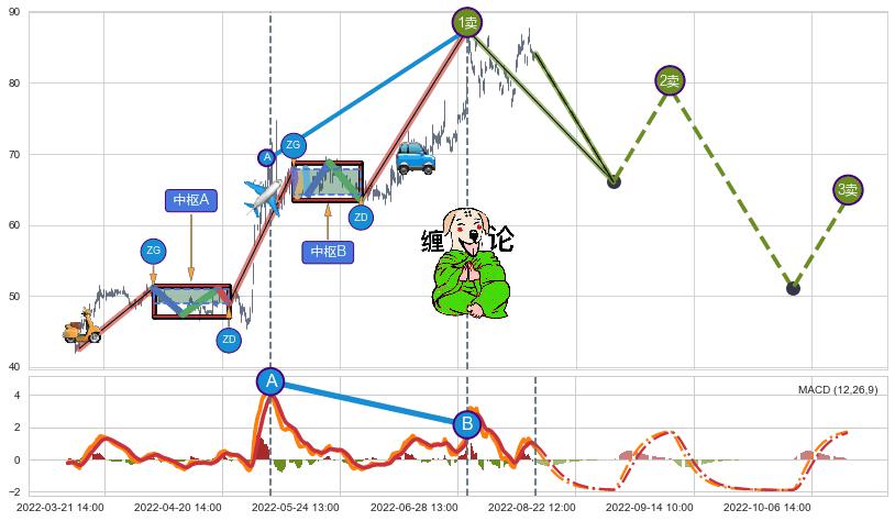 ➣ 缠论买卖点:上升缠中枢AB形成后猜想拐点1卖已到达,猜想后续持续下跌(均值回复)
