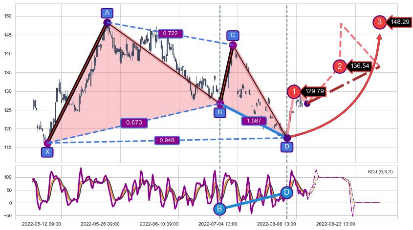 ➢ 谐波价格D点比B点低 ⤵,【KDJ】指标D点比B点高 ⤴️
