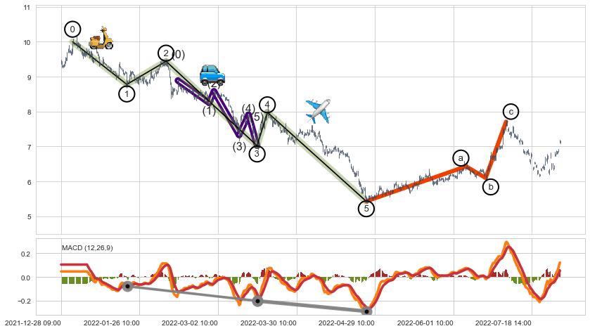 ➢ 波浪理论:猜想击穿突破c点后继续上涨 → 上涨 → 机会信号 → 小趋势跟踪