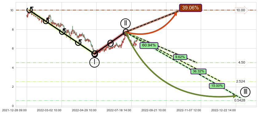 ➣ 调整浪已超过预测的c点位置,后续大趋势循环浪继续下跌概率60.94%,谨慎做多