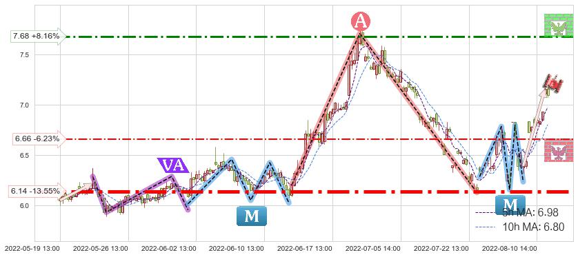 ♘ 阻力价格位7.68,可信任强度56.98%,距离最后交易2022-08-12 14:00形成的收盘价格7.10相差 +8.16%