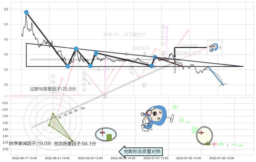 ➢ 【多方力量耗尽,空方打破攻守平衡点】下降三角形中继整理, 已在07-15:13突破【支撑】颈线 3.600 →演变成下降通道