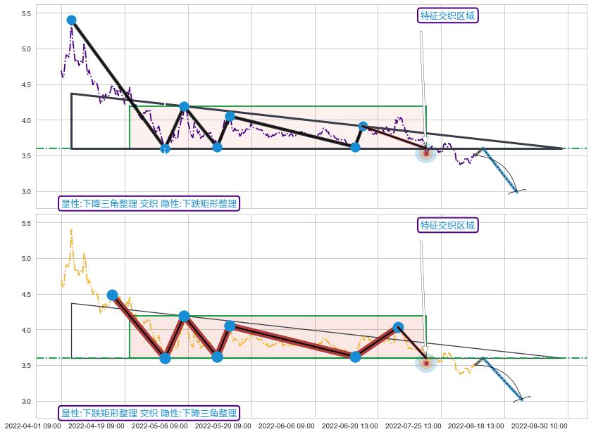 ➣ 下跌螺旋桨 + 下降三角整理支撑破位转换阻力下跌信号叠加后【目标达成率】中等,【看空】信号叠加【存续影响中等】