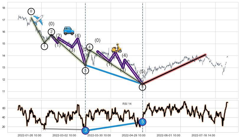 ➣ 第一, 三, 五浪下跌动能逐渐【衰弱变小】,趋势呈现不稳迹象