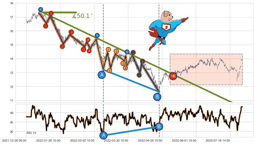 ➣ 【RSI】下跌趋势出现【常规背离 & 反转信号】背离程度57.86%,背离夹角角度84.5˚,背离程度较大