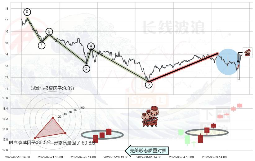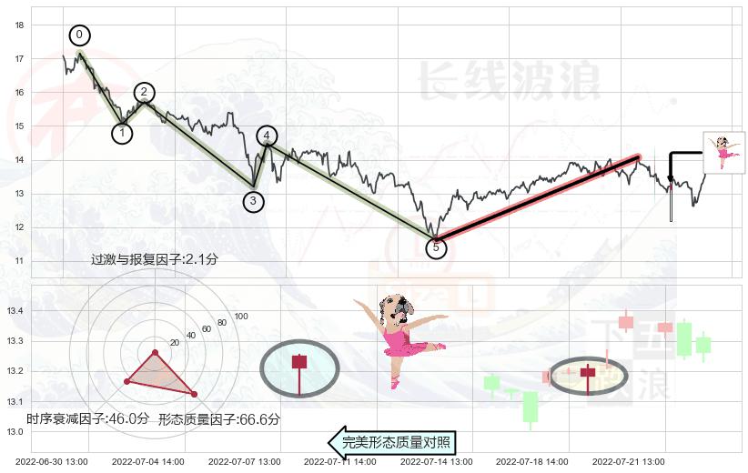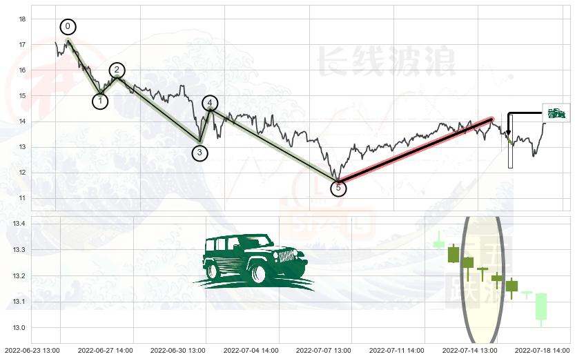 从2022-06-13 09:00至2022-06-28 14:00,共包含39个小时,阶段股价上涨0.97%,阶段股价变动位移路程比: 1 : 23