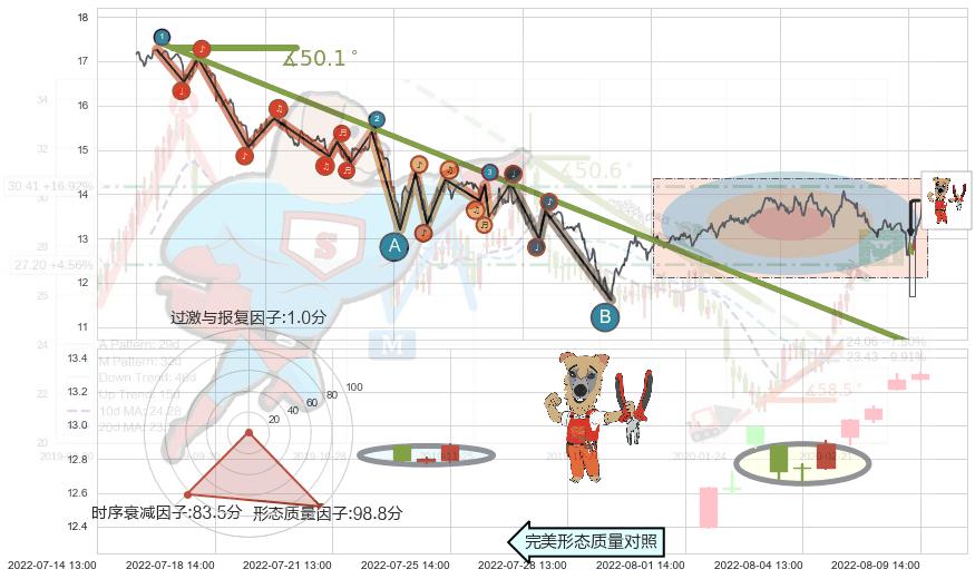 从2022-06-28 14:00至2022-08-12 14:00,共包含65个小时,阶段股价下跌-0.86%,阶段股价变动位移路程比: 1 : 43