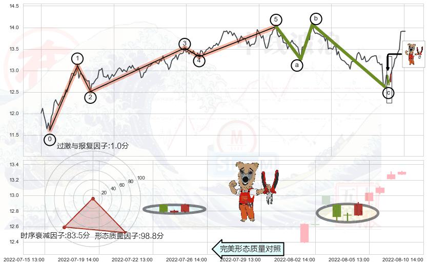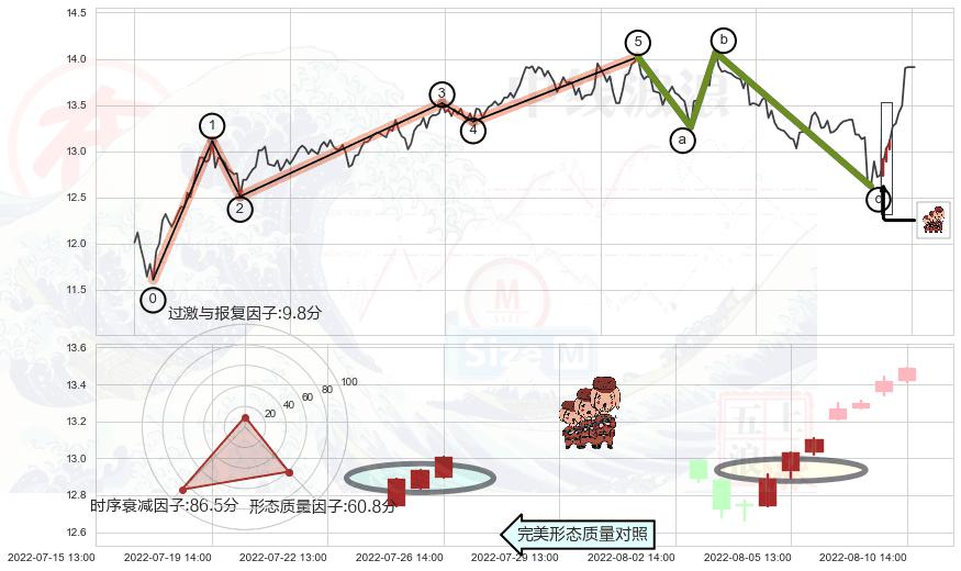 从2022-07-15 14:00至2022-08-12 14:00,共包含39个小时,阶段股价上涨6.76%,阶段股价变动位移路程比: 1 : 3