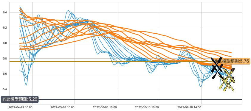 ➢ 60小时均线于(07-29 14:00: 5.72)形成【死叉】基于【死叉历史模型】预测死叉后最低波谷价格: 5.26, 死叉后最低价格5.34,尚未达到预测最低波谷价格, 预期继续下跌