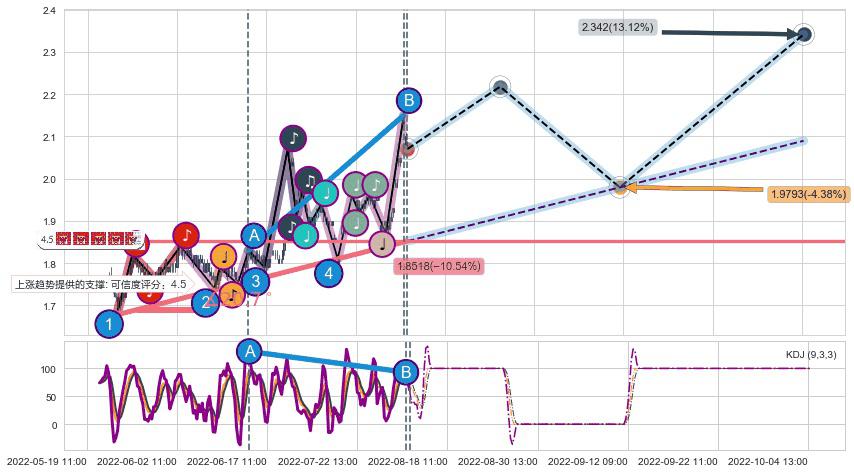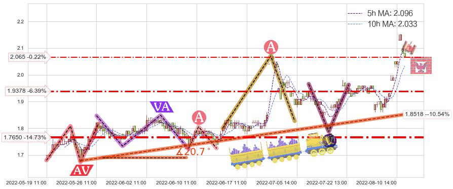 ♘ 在最后的上升阶段2022-05-24 14:00至2022-08-12 14:00存在 持续未破位的支撑位 ,支撑价格1.8518,支撑可信任强度87.02%,其距离最后价格2.070相差 -10.54%