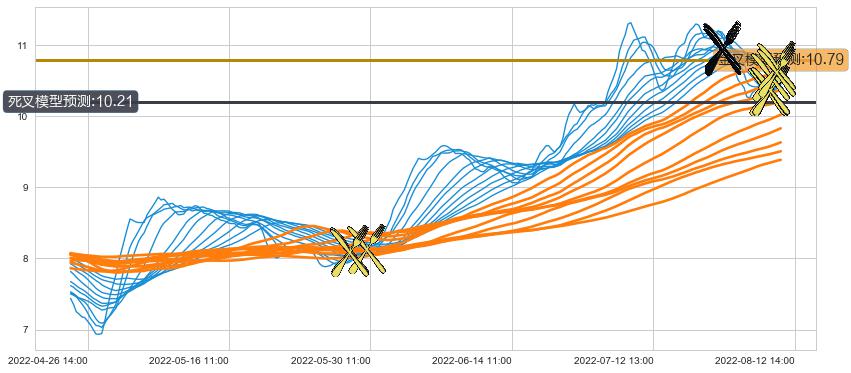 ➢ 13小时均线于(08-10 14:00: 10.36)形成【金叉】基于【金叉历史模型】预测金叉后最高波峰价格: 10.64, 金叉后最高价格10.75,已经上涨超出预测最高波峰价格, 预期回调