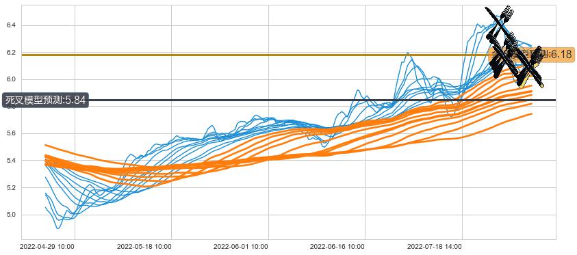 ➢ 30小时均线于(08-01 14:00: 6.22)形成【死叉】基于【死叉历史模型】预测死叉后最低波谷价格: 5.98, 死叉后最低价格5.94,虽然已经到达预测最低波谷价格,但耗时间很短动能很强, 预期继续下跌