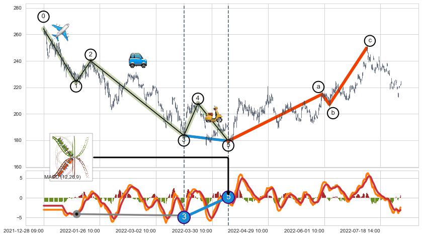 ➣ 波浪理论:猜想达到c点后小反弹终止反转下跌 → 下跌 → 【拐点】临近 → 阶段均值回复结束后继续大周期趋势跟踪