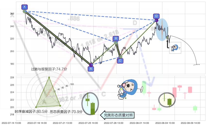 ➣ 下跌螺旋桨 + 谐波蝙蝠d拐点下跌阻力信号叠加后【目标达成率】中等,【看空】信号叠加【存续影响中等】
