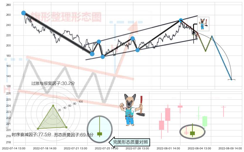➣ 下跌螺旋桨 + 升旗形临近支撑猜想转换阻力下跌信号叠加后【目标达成率】中等,【看空】信号叠加【存续影响中等】