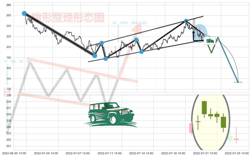 ➢ 高点影线(07-28:14: 233.00 )→回踩→第二根k线高点(07-27:13: 232.85 )