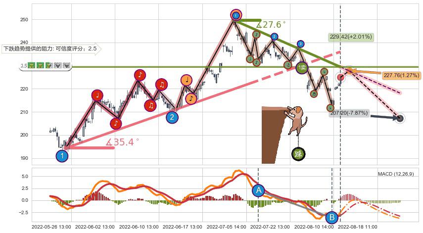 ♘ 在最后的下跌阶段2022-06-30 13:00至2022-08-12 13:00,存在 持续未破位的阻力位 ,阻力价格229.42,可信任强度68.25%,其距离最后价格224.90相差 +2.01%