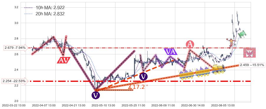 ♘ 支撑价格位2.254,可信任强度77.16%,距离最后交易2022-08-12 14:00形成的收盘价格2.910相差 -22.53%