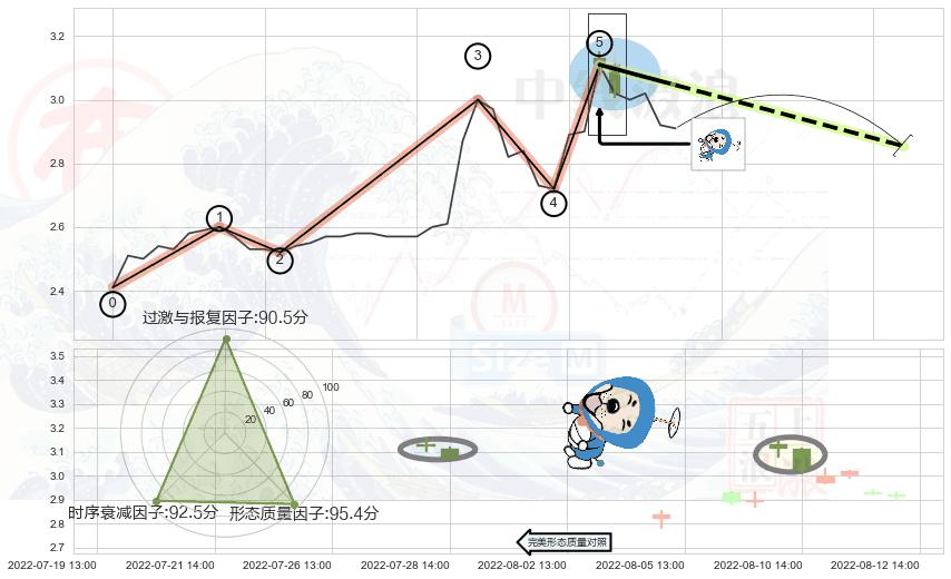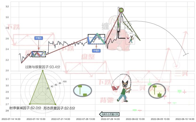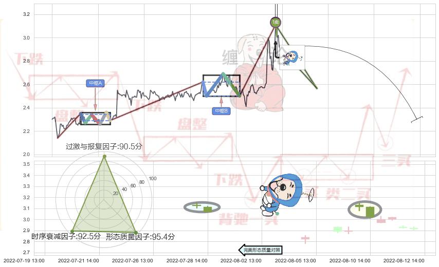 从2022-04-27 09:00至2022-08-12 14:00,共包含243个小时,阶段股价上涨33.87%,阶段股价变动位移路程比: 1 : 6,上涨趋势角度: 17.2,2022-08-02 13:00向⇪形成缺口,跳空上涨+9.96%