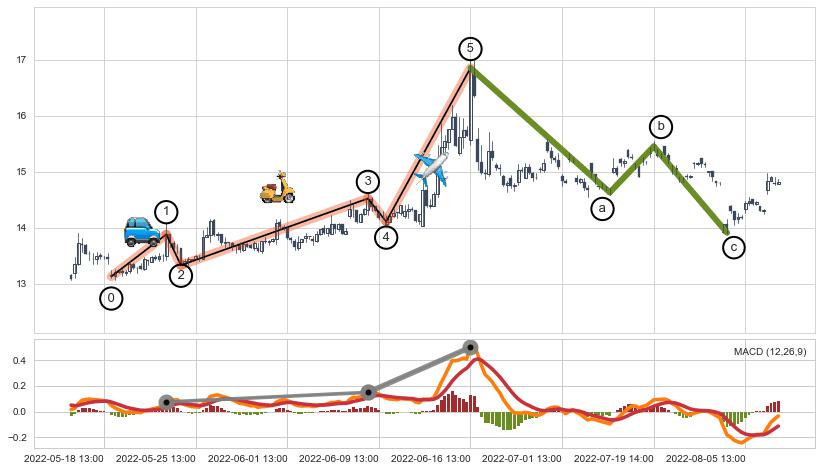➣ 波浪理论:猜想击穿破位c点后继续下跌 → 下跌 → 风险信号 → 小趋势跟踪