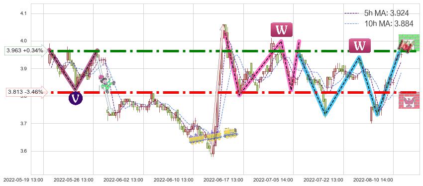 ♘ 阻力价格位3.963,可信任强度87.81%,距离最后交易2022-08-12 14:00形成的收盘价格3.950相差 +0.34%