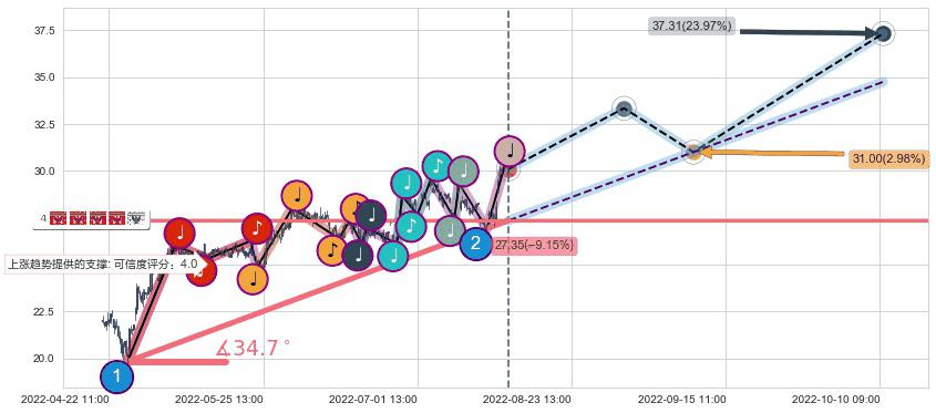 ♘ 在最后的上升阶段2022-04-26 14:00至2022-08-12 14:00存在 持续未破位的支撑位 ,支撑价格27.35,支撑可信任强度82.28%,其距离最后价格30.10相差 -9.15%
