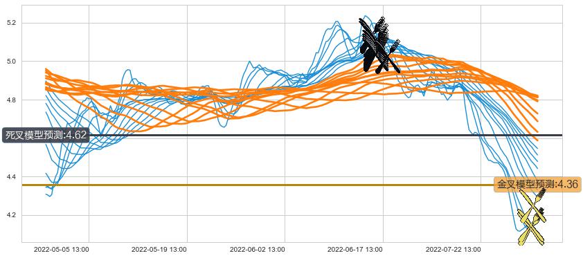 ➣ 70小时均线于(06-16 14:00: 5.03)形成【死叉】基于【死叉历史模型】预测死叉后最低波谷价格: 4.57, 死叉后最低价格4.10,已经下跌超出预测最低波谷价格, 预期反弹