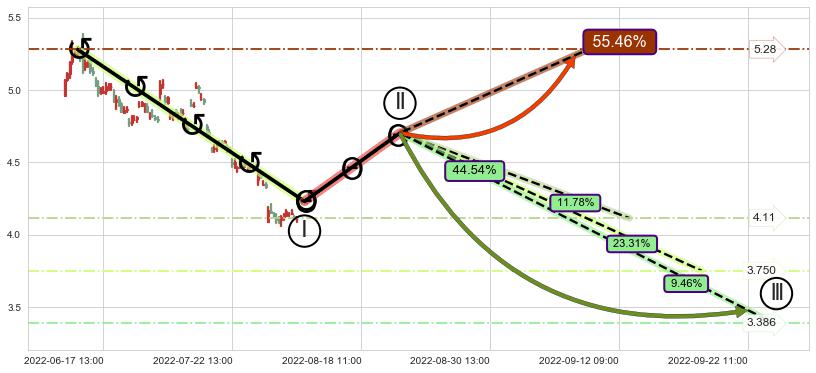 2022-06-14: 时域附近第一阻力位5.01持续的对下跌趋势进行阻拦,有效地放缓了下跌的速度。
